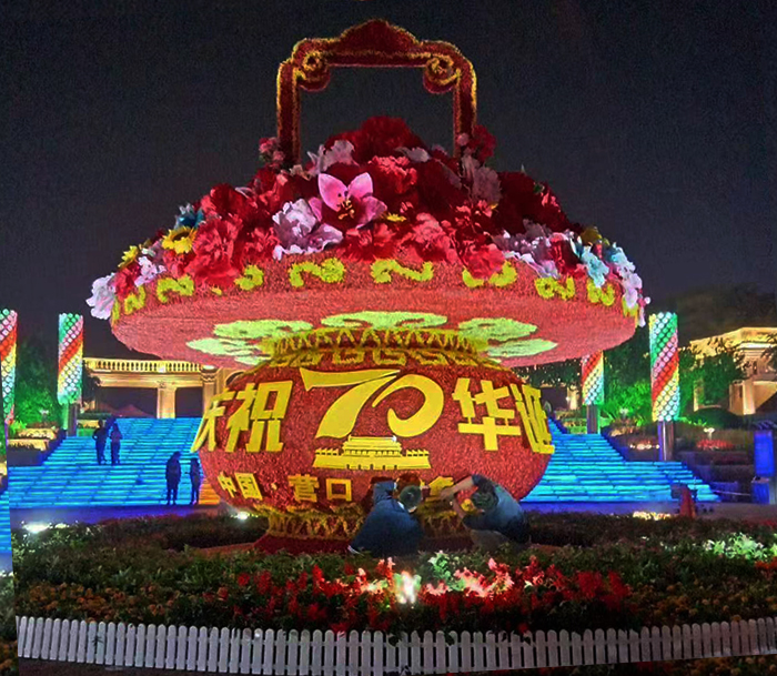 不知道大家是否還記得70周年時亮相天安門廣場的“祝福祖國”巨型花籃,獲得游客和當地居民爭相拍照,受次啟發以及客戶產品需求,龍君展覽在國慶前期也設計制作了一款仿真綠雕“大花籃”,坐落于遼寧營口鲅口圈區的廣場上,花籃的籃身上“慶祝70華誕”幾個大字赫然醒目,表達對祖國生日的美好祝福。
