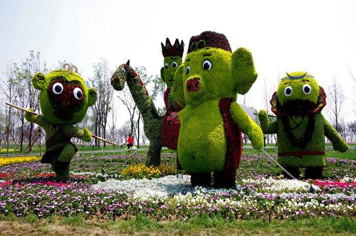 安裝在水上的卡通綠雕,卡通造型可愛,多種顏色搭配制作而成,使卡通形象更加立體化。