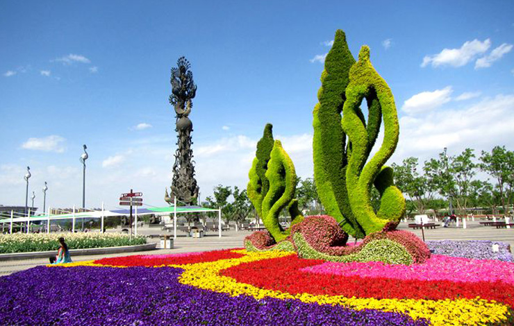 綠雕”被譽(yù)為世界園林藝術(shù)的奇葩,是一種有生命的植物雕塑。一般內(nèi)設(shè)鋼材構(gòu)架,然后在構(gòu)架上填充栽培土,再于其上種植一年生或多年生小灌木或草本植物,即采用掛泥插草或卡盆工藝把不同顏色的花草覆蓋在結(jié)構(gòu)造型的表面,巧妙地把雕塑造型與花卉園藝結(jié)合在一起,鋼架表面的植物覆蓋率至少要達(dá)到80%。因此,綠雕是充滿生機(jī)的“花卉雕塑”,是人類運(yùn)用自然力量創(chuàng)造出的又一園藝文明。